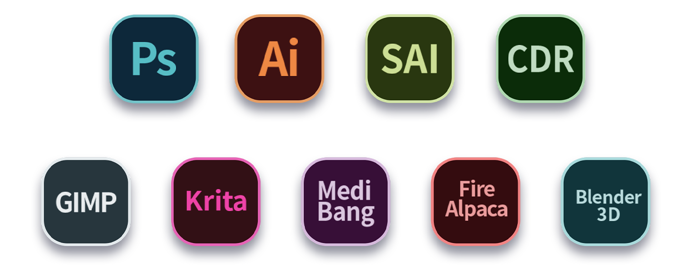 Support most major digital art software such as Photoshop, Illustrator, SAI, CDR, GIMP, Krita, MediBang, FireAlpaca and Blender3D, etc.